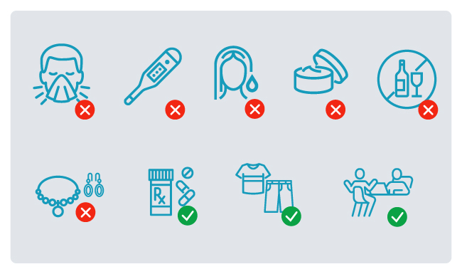 - Utilice ropa holgada y cómoda el día del estudio. Evite en lo posible el uso de joyas (sobre todo collares y aretes) y accesorios para el cabello (ganchos, bandas, diademas).